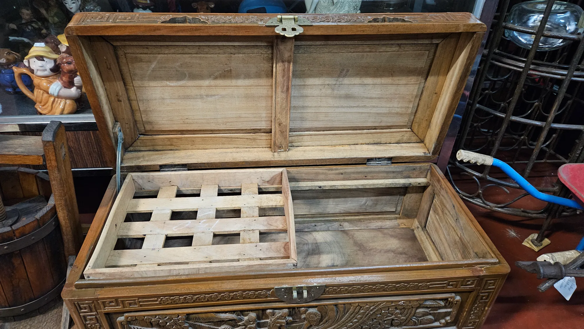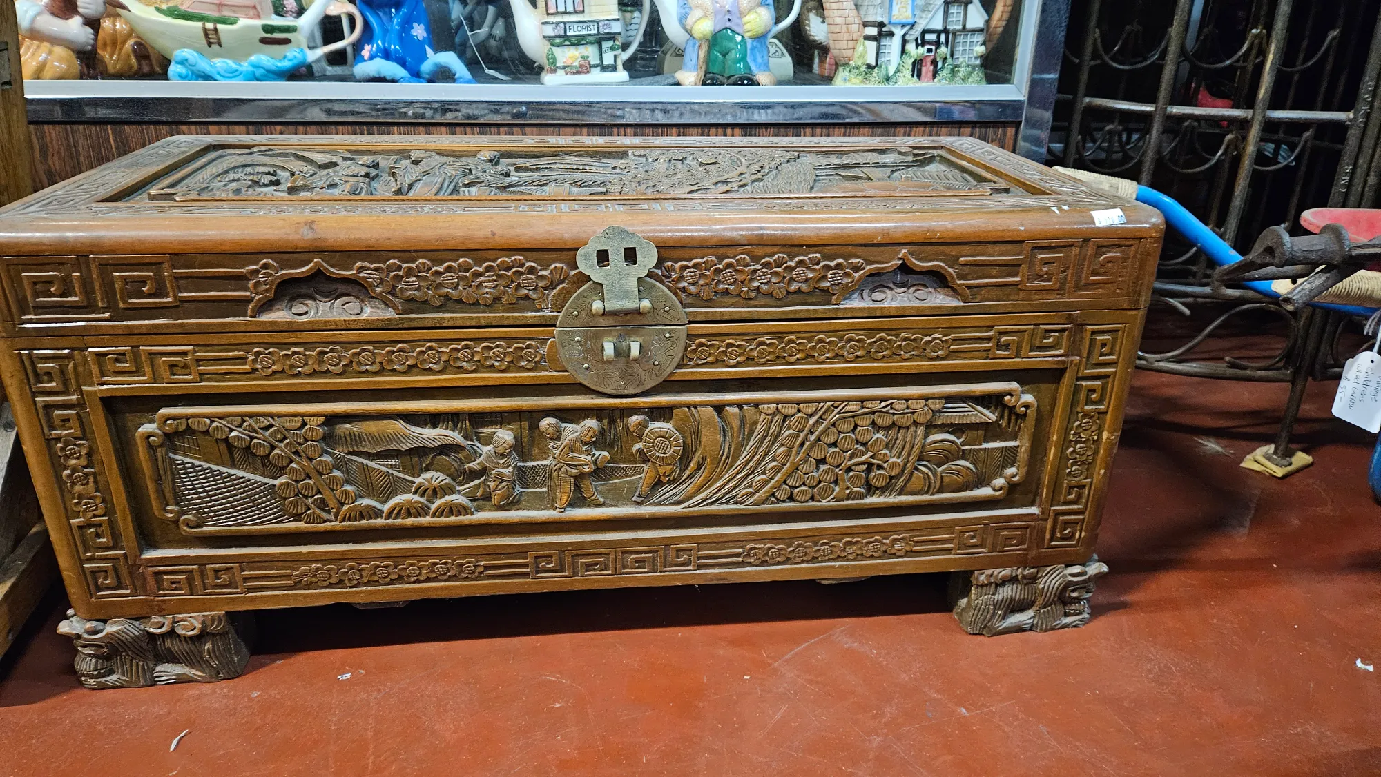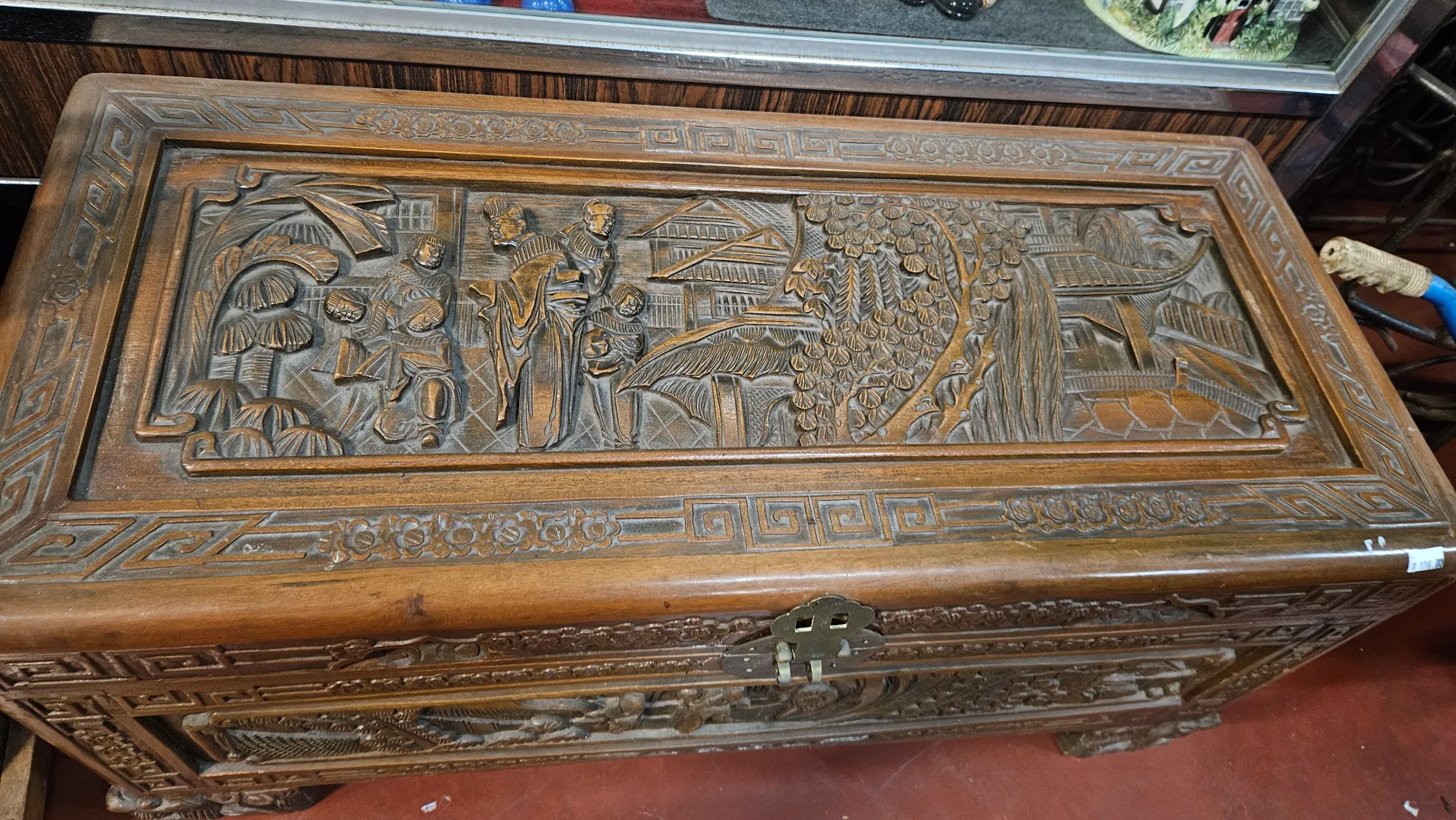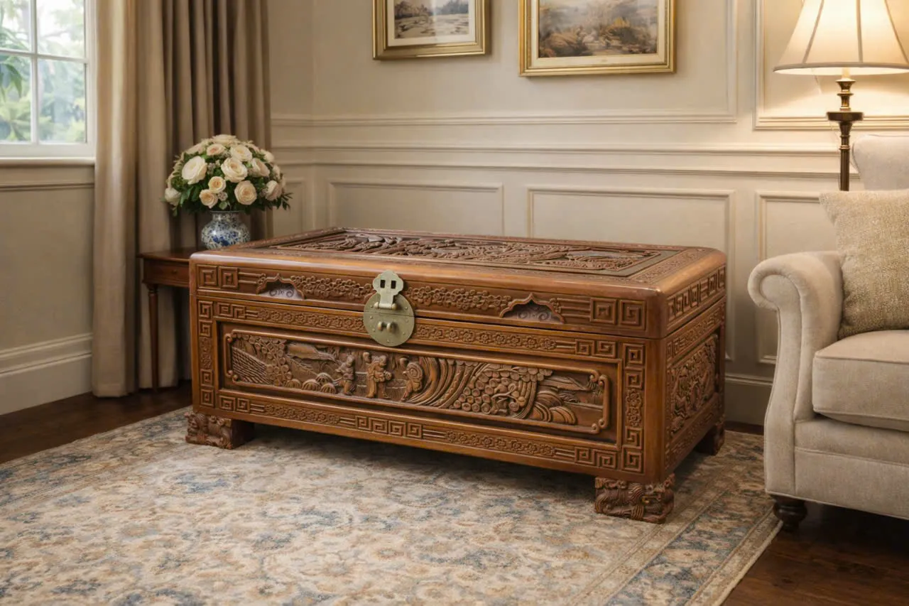 This beautiful hand-carved vintage timber storage trunk features traditional Asian craftsmanship and design. It is perfect for storing blankets, clothes, or household items while adding a unique decorative touch to your home.